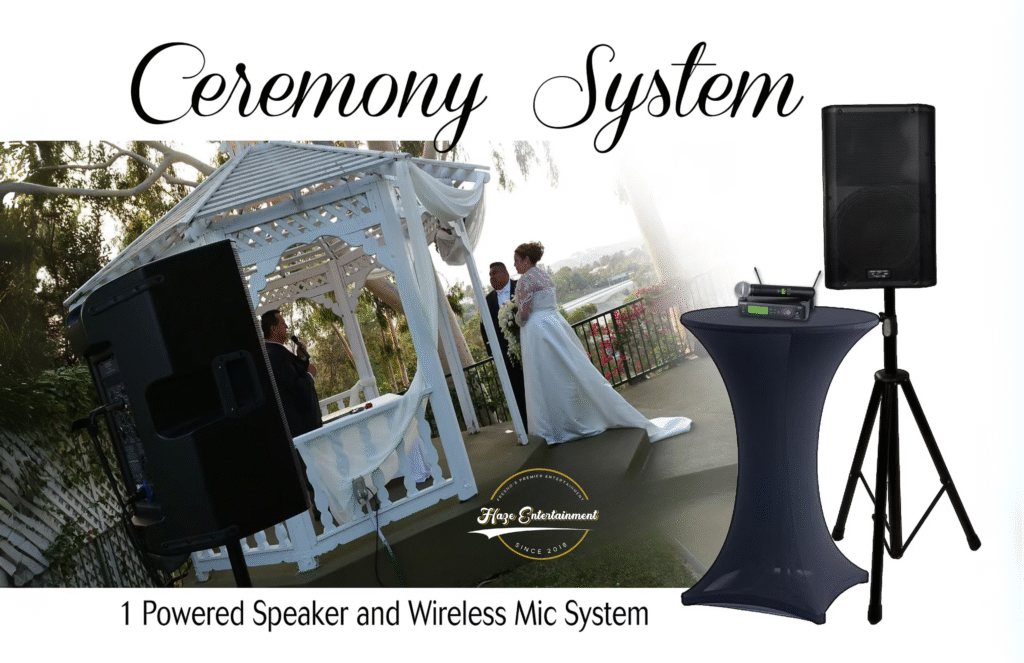 No worries we have you covered, Our Battery Powered Ceremony System includes a Very Powerful and Crystal Clear Speaker and Wireless Mic.