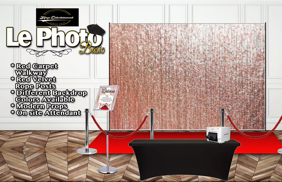 The Red Carpet Photo Booth!!! Feel like a MOVIE STAR at your Event!. Package includes Rep Carpet Background Red Velvet Rope and Post, Welcome sign and unlimited prints. Minimun 2 Hours