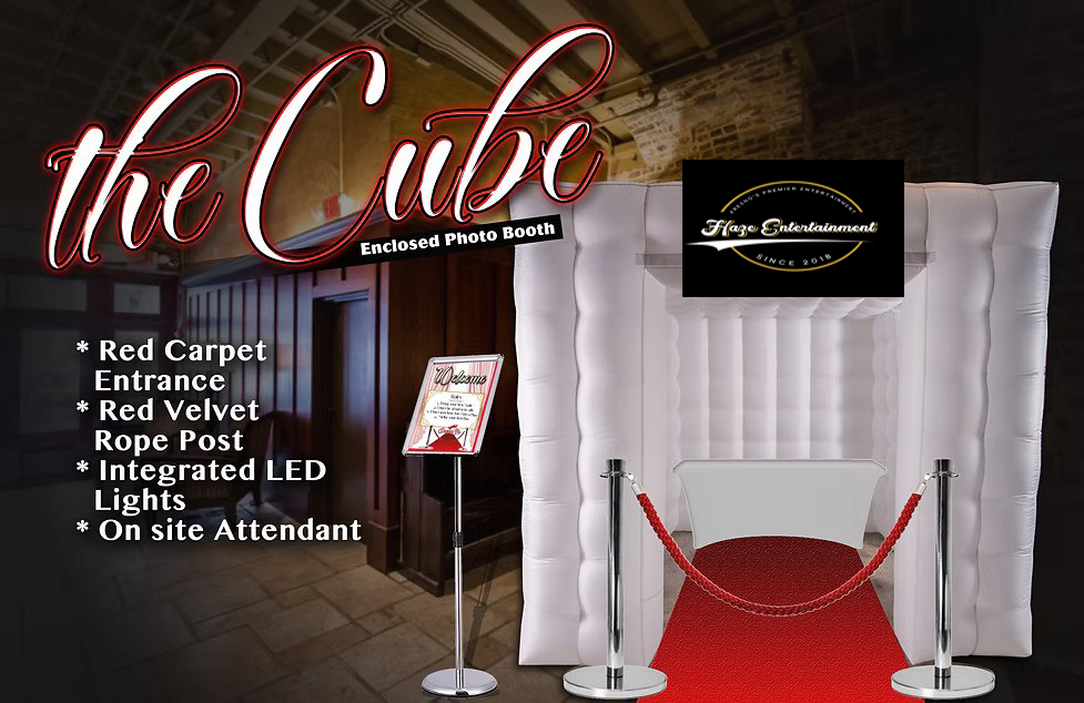 Our Enclosed Photo Booth!!! Elegant Enclosed LED Booth with custom Backdrop and a Royal Red Carpet Entrance. Package include inflatable 10x10 LED Cube, Welcome sign and unlimited prints. Minimun 2 Hours